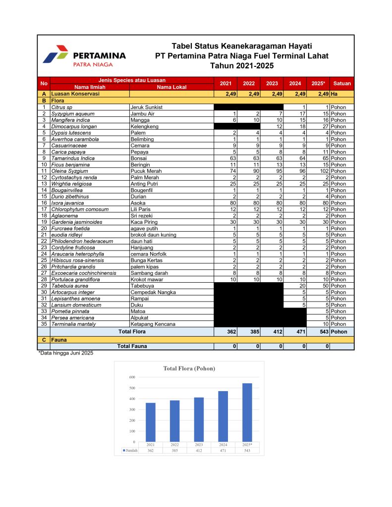 Sebagai komitmen kepeduliaan FT Lahat kepada pelestarian keanekaragaman hayati khususnya di Kabupaten Lahat, kami berupaya untuk dapat mengonservasi flora maupun fauna yang berstatus endemik, rentan punah, maupun yang masih banyak tumbuh di lingkungan. Hal ini bertujuan agar kelestarian lingkungan hidup dapat selalu terjaga. Berikut merupakan status keanekaragaman hayati yang dikonservasi oleh FT Lahat dari Tahun 2021-2025.