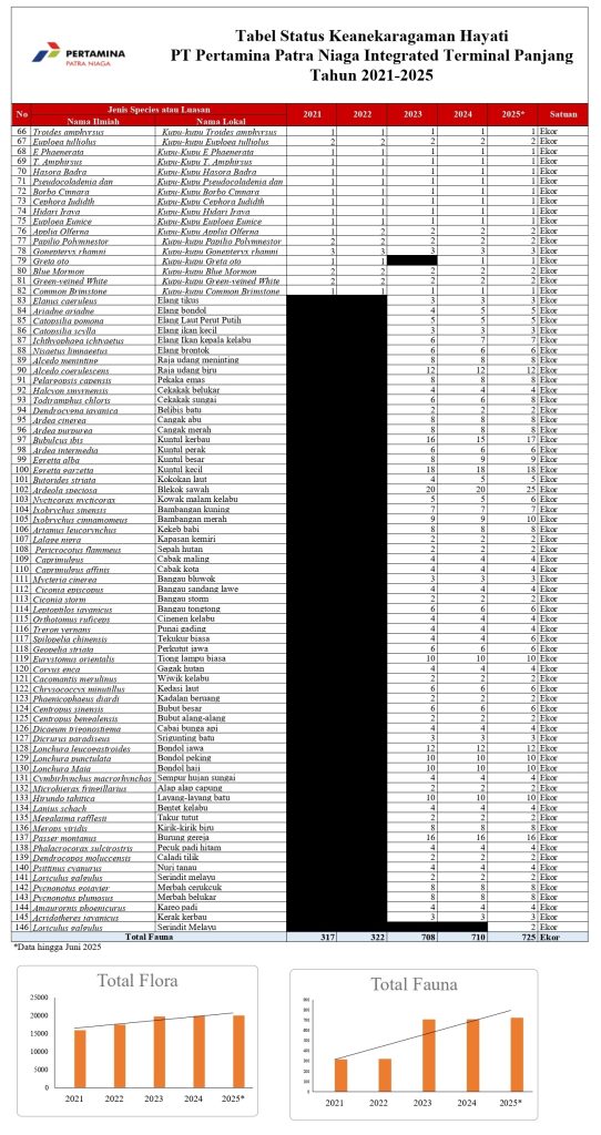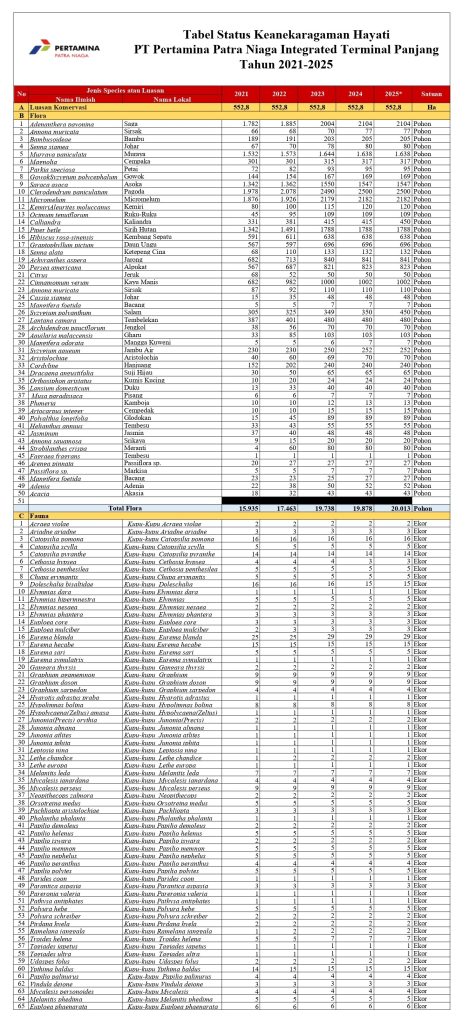 Sebagai komitmen dalam menjaga kelestarian lingkungan khususnya pada wilayah konservasi yang dijalankan oleh IT Panjang selalu berupaya agar terdapat peningkatan flora dan fauna setiap tahunnya untuk mencegah tingkat kepunahan terutama bagi keanekaragaman hayati yang dilindungi. Adapun status keanekaragaman hayati yang dikonservasi oleh IT Panjang dapat dilihat pada tabel berikut.